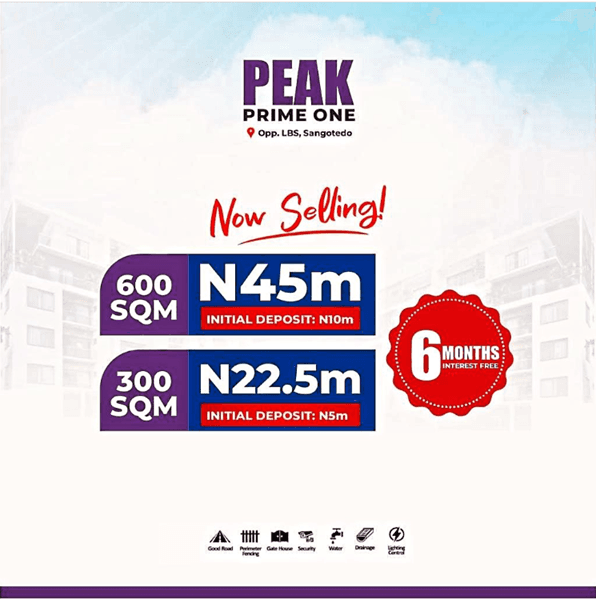 ₦45,000,000 for 600 sqm Peak Prime One Estate offers prime land located directly opposite the Lagos Business School, providing a strategic location for residential development.